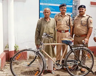पीड़ित वृद्ध परमात्मा मिश्र करते हैं मुंशीगीरी का कार्य साइकिल हो गई थी गायब तहरीर लेकर पहुंचे थे सीओ सदर कार्यालय सीओ सदर ने दिया नई साईकिल का उपहार
